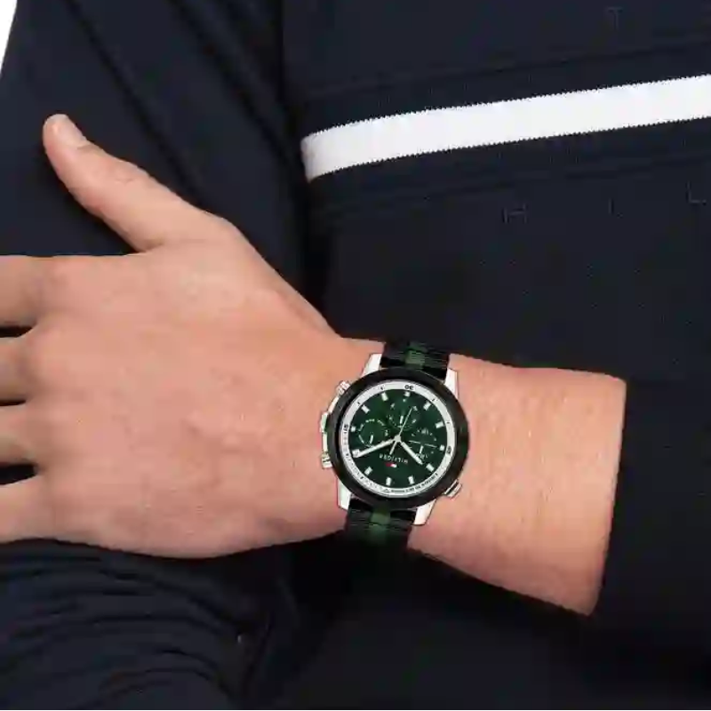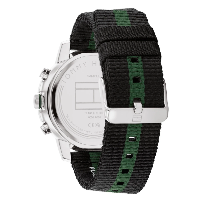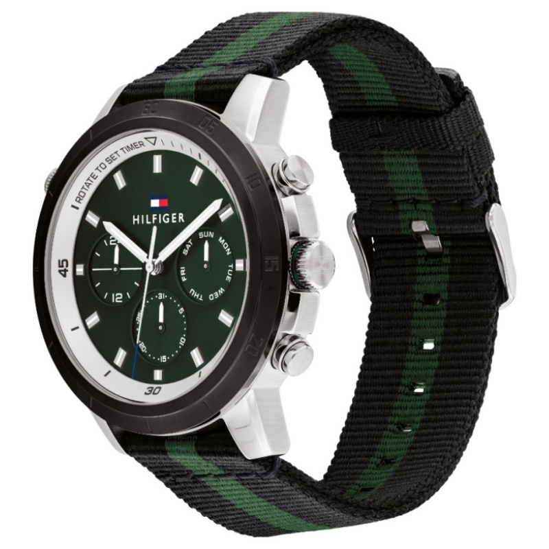 Tommy Hilfiger Men's Watch. Time is on your side with ourmodern take on the casual watch. The rugged multi-layered textured dial with arotating reflector ring is surrounded by a stainless-steel case. Multifunctionmovement and a left-side pusher (timer) will ensure that you stay on time whilelooking good. Ocean-Bound Plastic Textile Strap with recycled steel case.