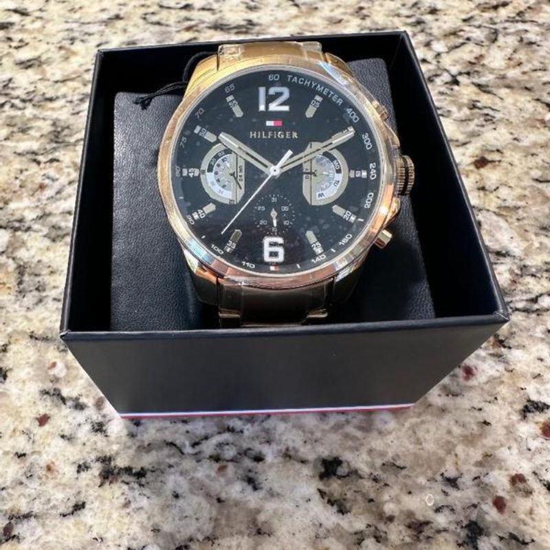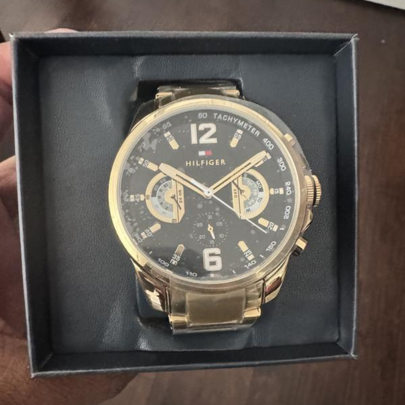This amazing TommyHilfiger Gold Steel Black Dial Multi-function Men's Watch (1710638) is thepinnacle of fashion and functionality. This watch is the epitome of luxury withits precise quartz movement, 46mm case diameter, and elegant ionic gold finish.Its ionic-plated thin gold steel strap and black dial enhance its refinement,and its push-bottom buckle and 5 ATM water resistance guarantee longevity anduser-friendliness. This gorgeous watch will add flair to your outfit and createa striking impression.
