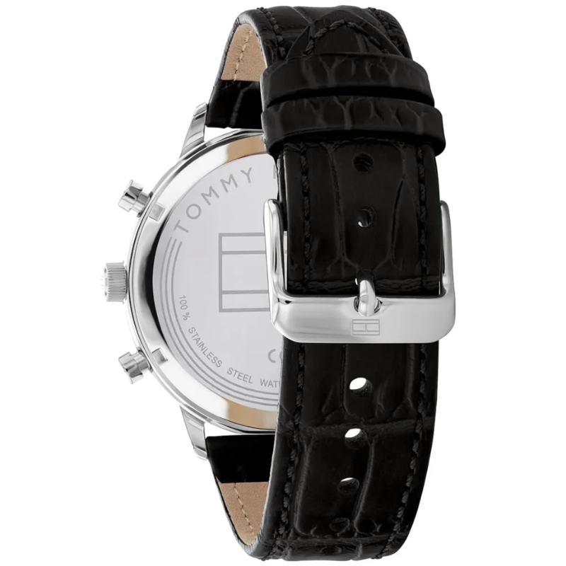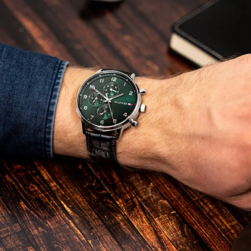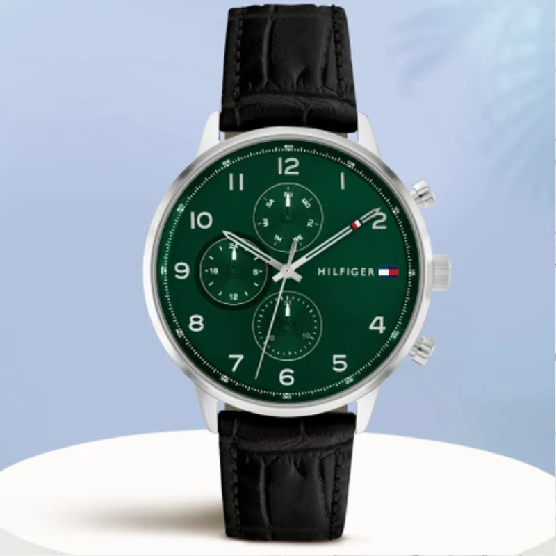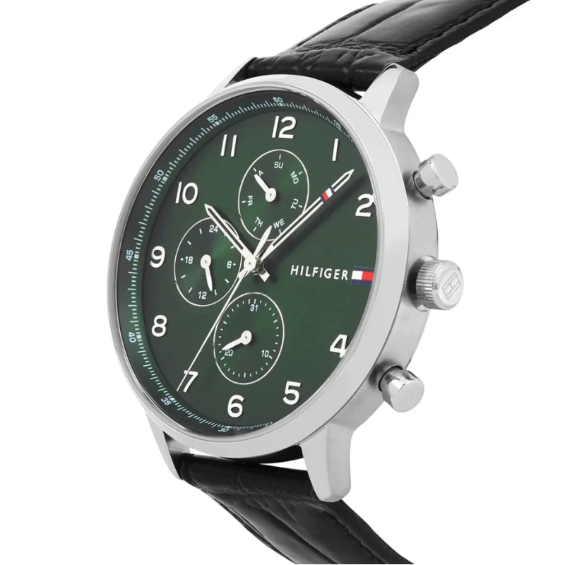 This fashionablewatch has a 44mm stainless steel body, a 10.20mm case thickness, and a quartzmultifunction movement. The dial is green and has an Arabic index. The band hasa tongue buckle fastening, 5ATM water resistance, and is made of black leather.