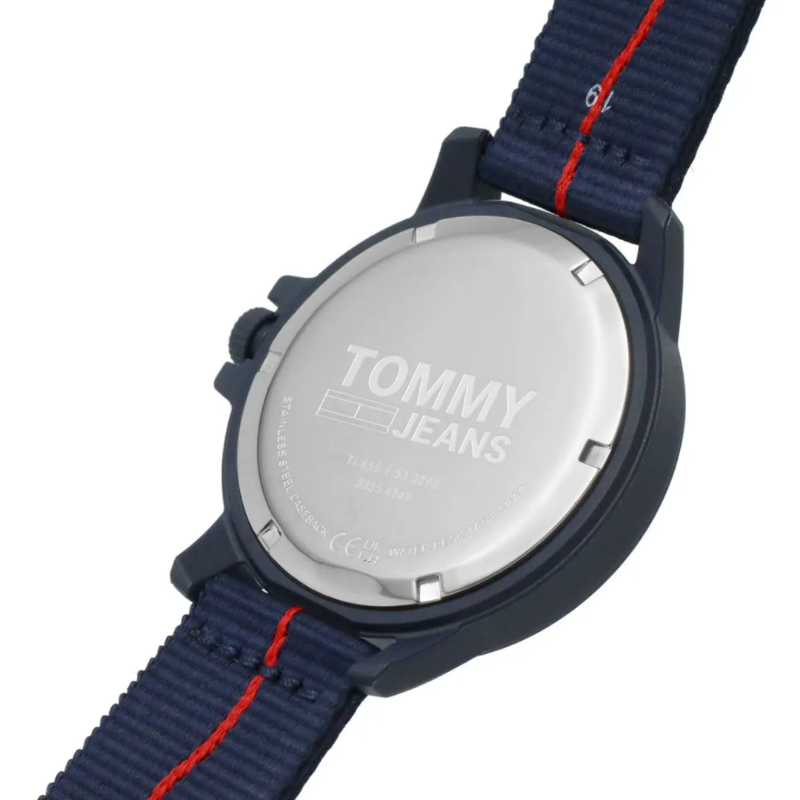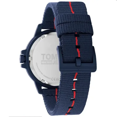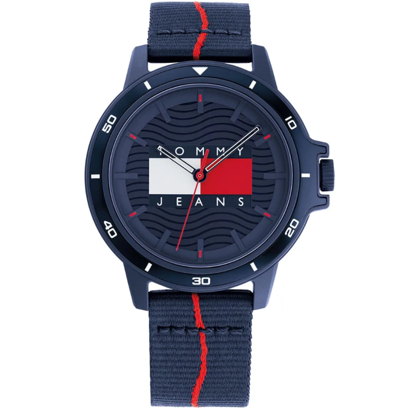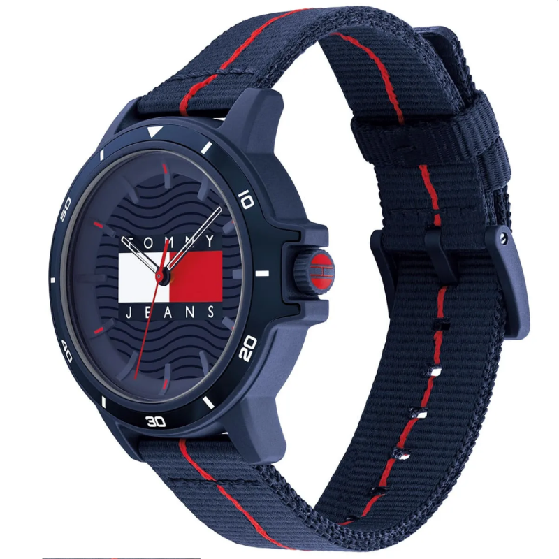 Tommy Hilfiger men’s watch. UrbanTommy Jeans design featuring recycled fish net case and 100% recycled oceanbound plastic strap. A wave detailed dial revives a nautical vibe with boldlogo.