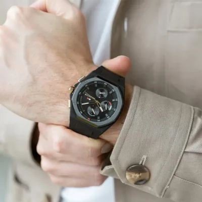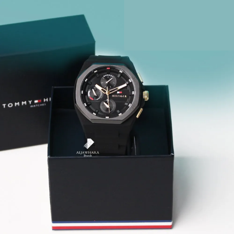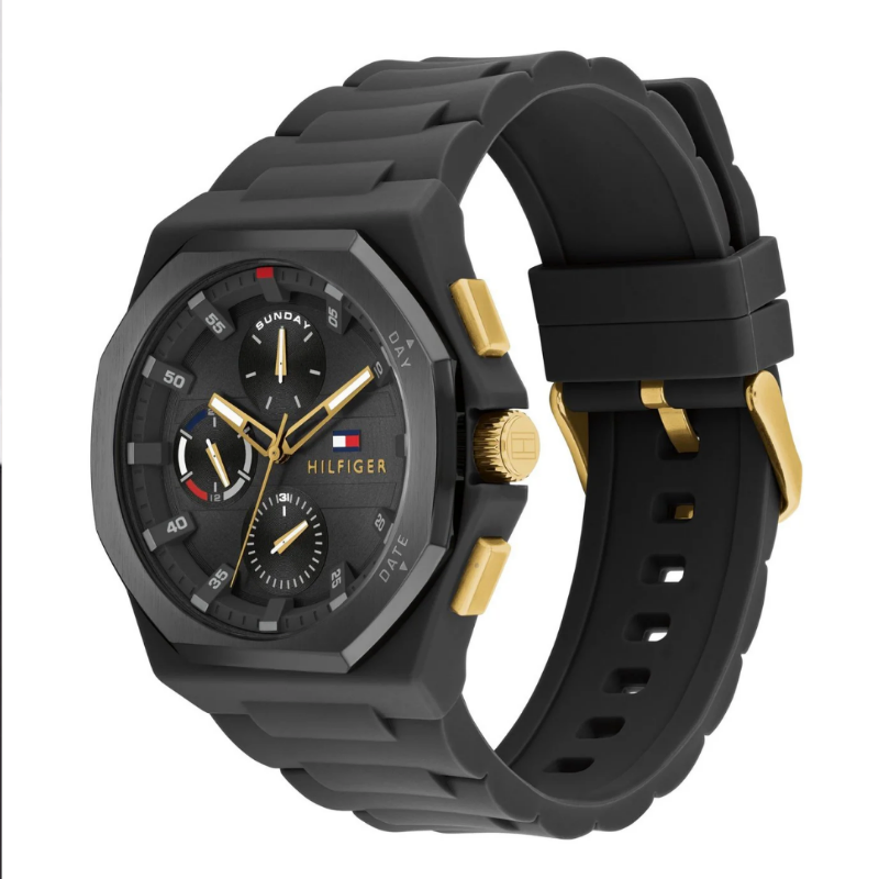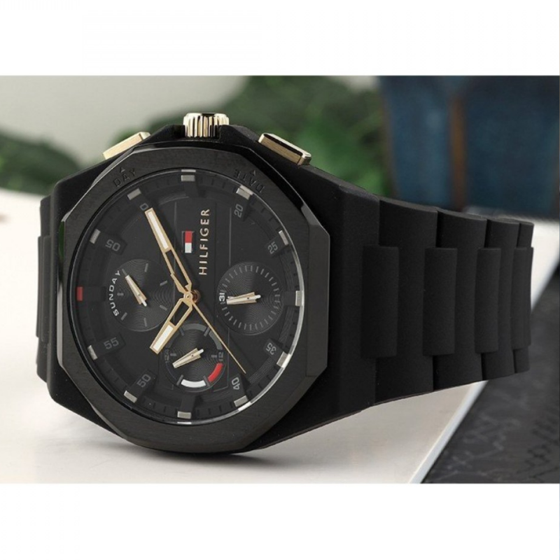 Quality Materials:Tommy Hilfiger Men's black plastic and glass fiber and black silicone case,black dial with index, black silicone strap. Quartz Multifunction: It’s abattery-powered watch that sends energy through a quartz crystal. Is typicallybuilt into three separate dials for the day of the week, date of the month and24-hour time. Caring for your timepiece: Your Tommy Hilfiger watch has beendeveloped with meticulous attention to quality, function and detail. Amaintenance interval of 3 to 5 years is recommended, in addition to anyrequired battery replacement. Never open the watch yourself.