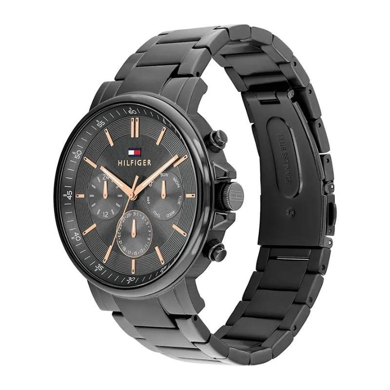 This Tommy Hilfigermen's watch has a 44 mm ionic-plated grey steel case and an accurate quartzmultifunction movement. Its 22 mm grey steel strap provides comfortable wear,and its elegant dark grey dial is shielded by a sturdy mineral crystal. Thiswatch combines fashion and functionality for daily usage with a thin 9.7 mmprofile, water resistance up to 5 ATM, and a safe push-button deployment clasp.
