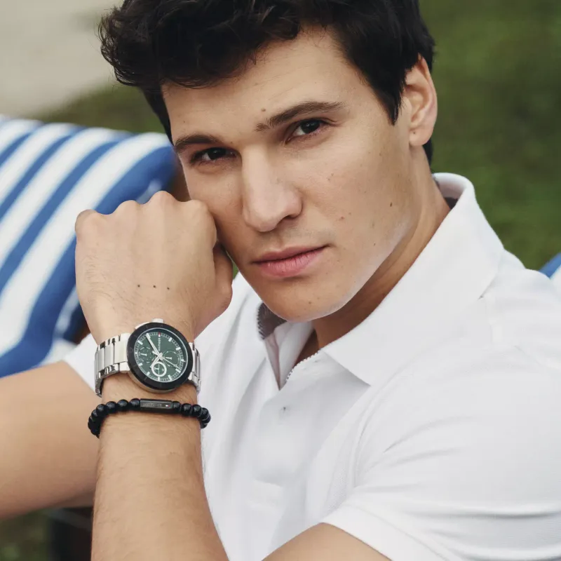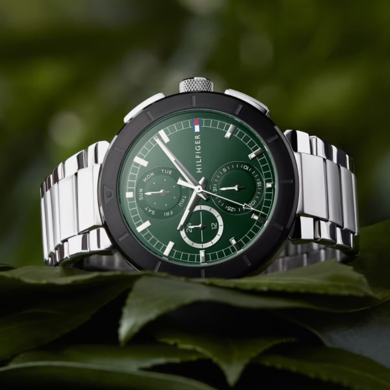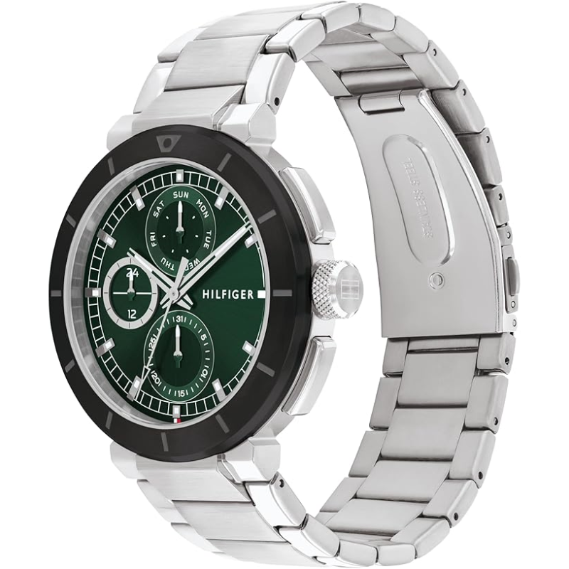 This watch features aprecise quartz movement and a versatile multi-function design. With a 44mm casediameter and 10.7mm thickness, it is sleek and stylish. The 14.05mm band widthand durable stainless steel strap make it comfortable to wear. The green dialadds a pop of color, while the mineral crystal material provides durability. Itis water-resistant up to 5 ATM and has a convenient push-button deploymentclasp. Elevate your style with this Tommy Hilfiger watch!