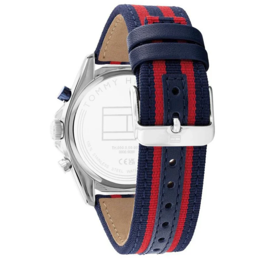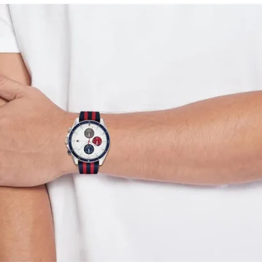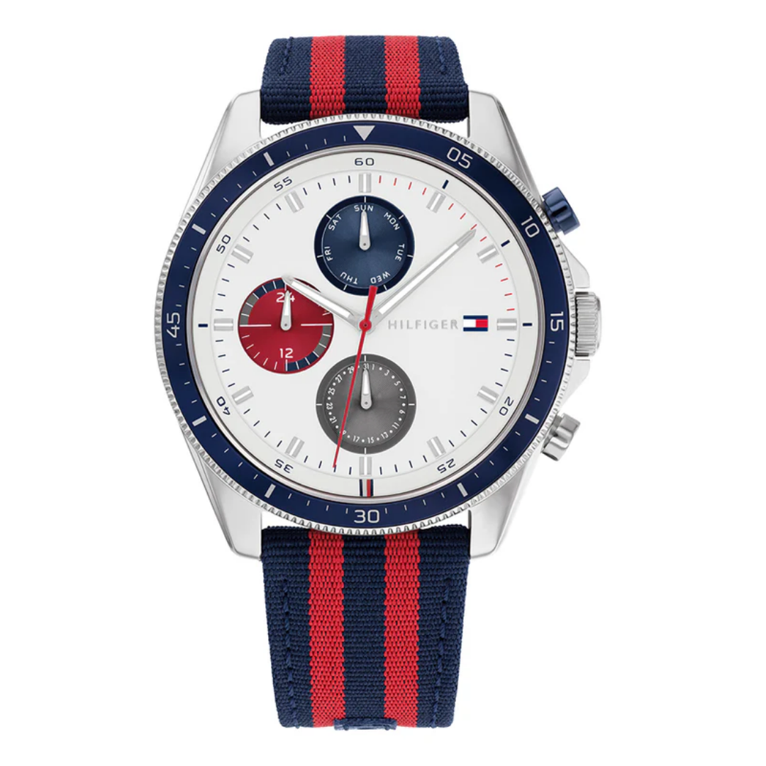 Experiencetimeless elegance with the Tommy Hilfiger Parker White Dial Nylon StrapWatch. The luxury brand's sophisticated design features a white dial and aclassic nylon strap, perfect for elevating any look. Don't miss out on thisexclusive piece from Tommy Hilfiger.