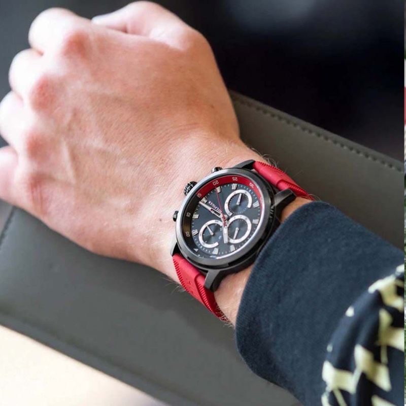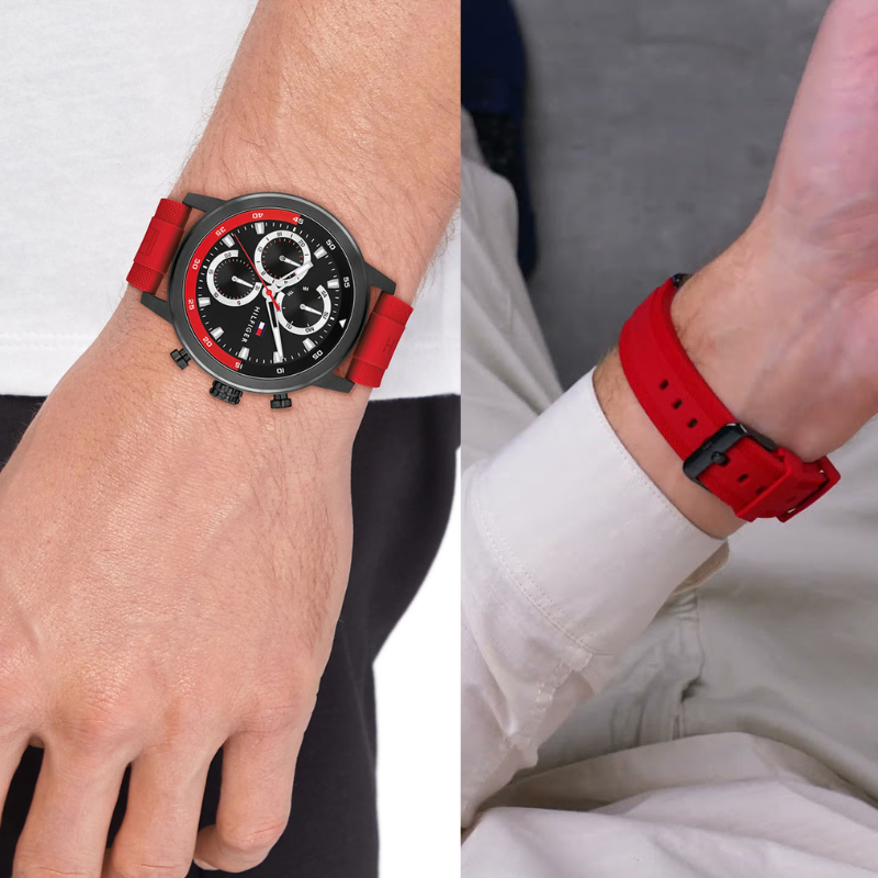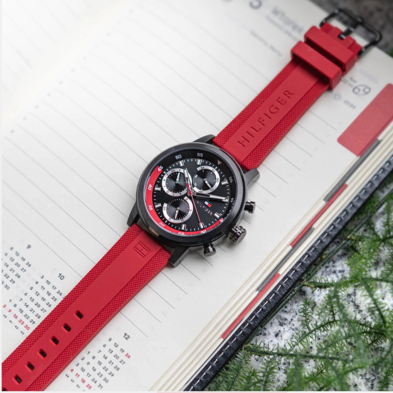Upgrade your everydaystyle with this HILFIGER men’s chronograph-style watch, featuring a bold blackdial, sporty multi-sub dial layout, and a striking red silicone strap.Comfortable to wear and easy to match, it’s a great pick for daily use, officewear, and weekend outings.