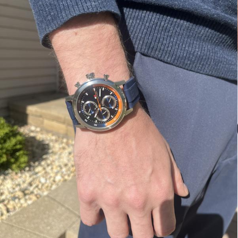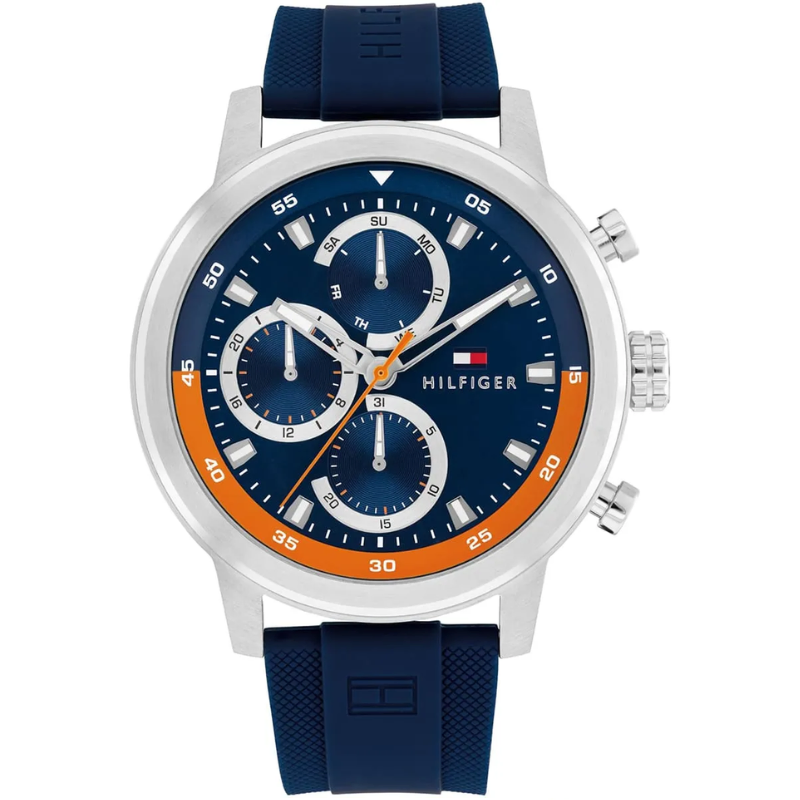 This men's watchfeatures a precise quartz multifunction movement housed in a 46 mm stainlesssteel case with a 10.8 mm thickness. Its vibrant blue dial is protected by adurable mineral crystal, complemented by a comfortable blue silicone strapmeasuring 22 mm wide. Designed for everyday wear, it offers water resistance upto 5 ATM and secures with a reliable tongue buckle clasp.