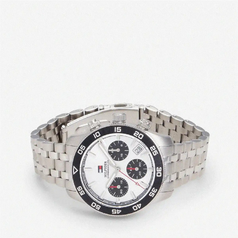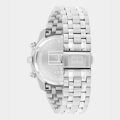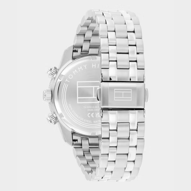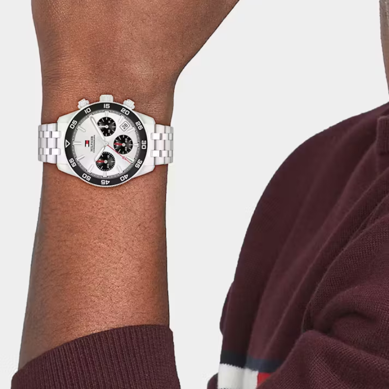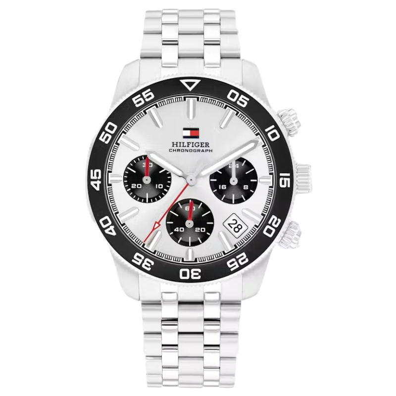 The Tommy Hilfiger men's watch combines sophisticated style with sporty precision, featuring a41mm case, sunray dial with TH Monogram, fine CD cut sub-eyes, applied indexes, and a date window. The coin edge sport bezel, solid link bracelets or genuine leather straps, and Japanese chronograph movement complete a timeless, elevated design.