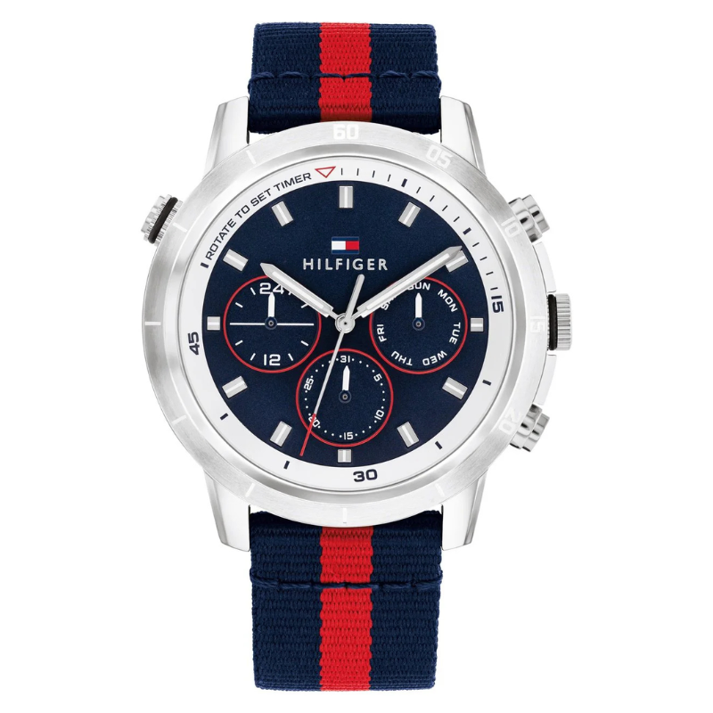 Bring a touch of sophistication to your everyday with the tommy hilfiger Troy watch. The sleek navy blue dial adds a pop of color to your look, while providing precise timekeeping. With its timeless design and functionality, this watch is a must-have for any fashionable man.