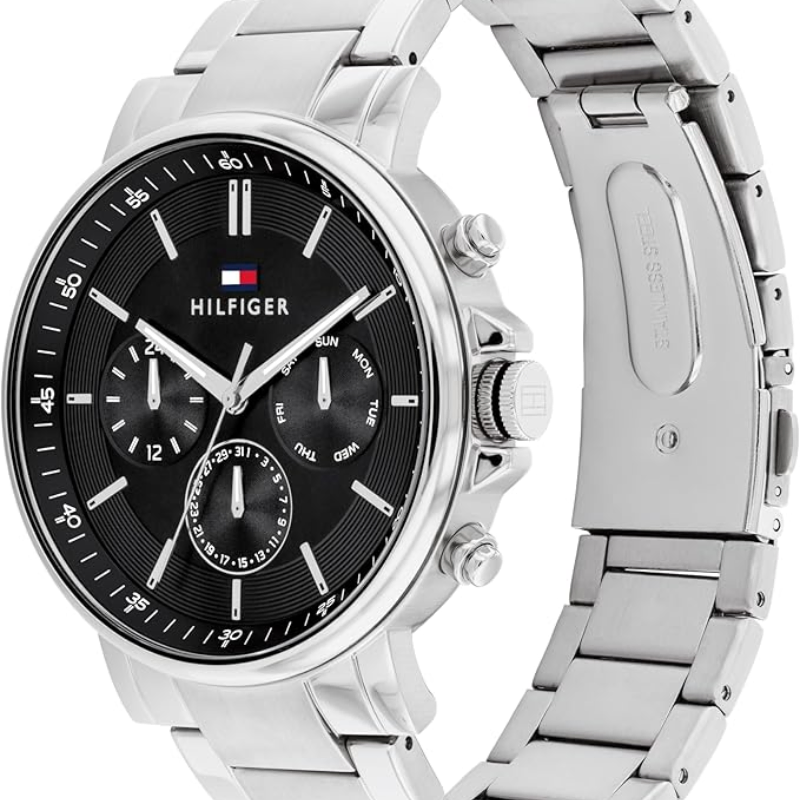 Tommy Hilfiger 1710667 — a sleek timepiece that blends modern style with everyday functionality. Featuring a bold black dial stainless steel case and bracelet, and multi-function sub dials showing day date, and 24-hour time. Powered by a reliable quartz movement and water-resistant up to 50 meters, this watch delivers both elegance and performance for any occasion.